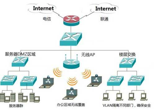 除了分布于各樓層的光纖連接交換機外,大樓內部同時(shí)也覆蓋了無(wú)線(xiàn)AP終端發(fā)射的無(wú)線(xiàn)網(wǎng)絡(luò )。采用密碼,二維碼等驗證方式,同時(shí)也受到安全審計系統的監督管理,保證網(wǎng)絡(luò )的安全運行。