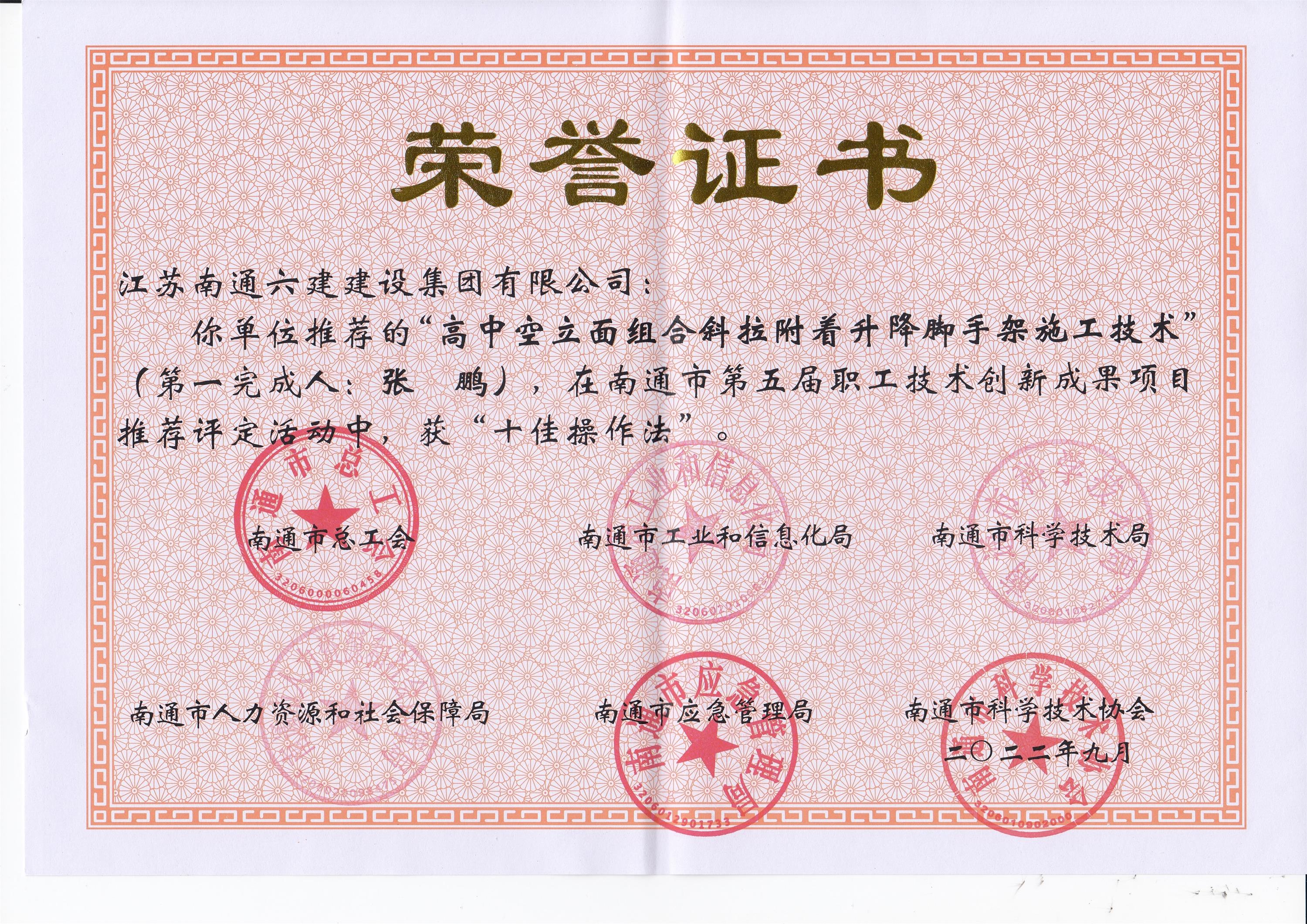 5 | 高中空立面組合斜拉附著(zhù)升降腳手架施工技術(shù) | 十佳操作法 | 2022.9 | 蘇中公司 |