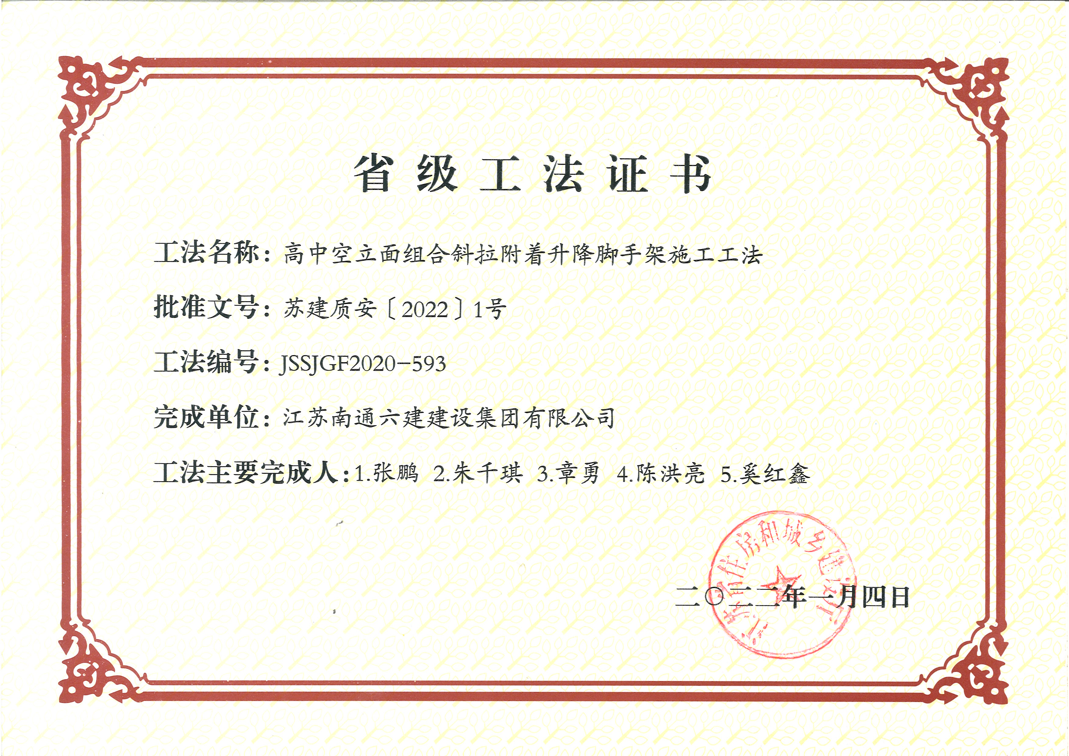 18 | 高中空立面組合斜拉附著(zhù)升降腳手架施工工法 | 江蘇工法 | 2022.1 | 蘇中公司 |