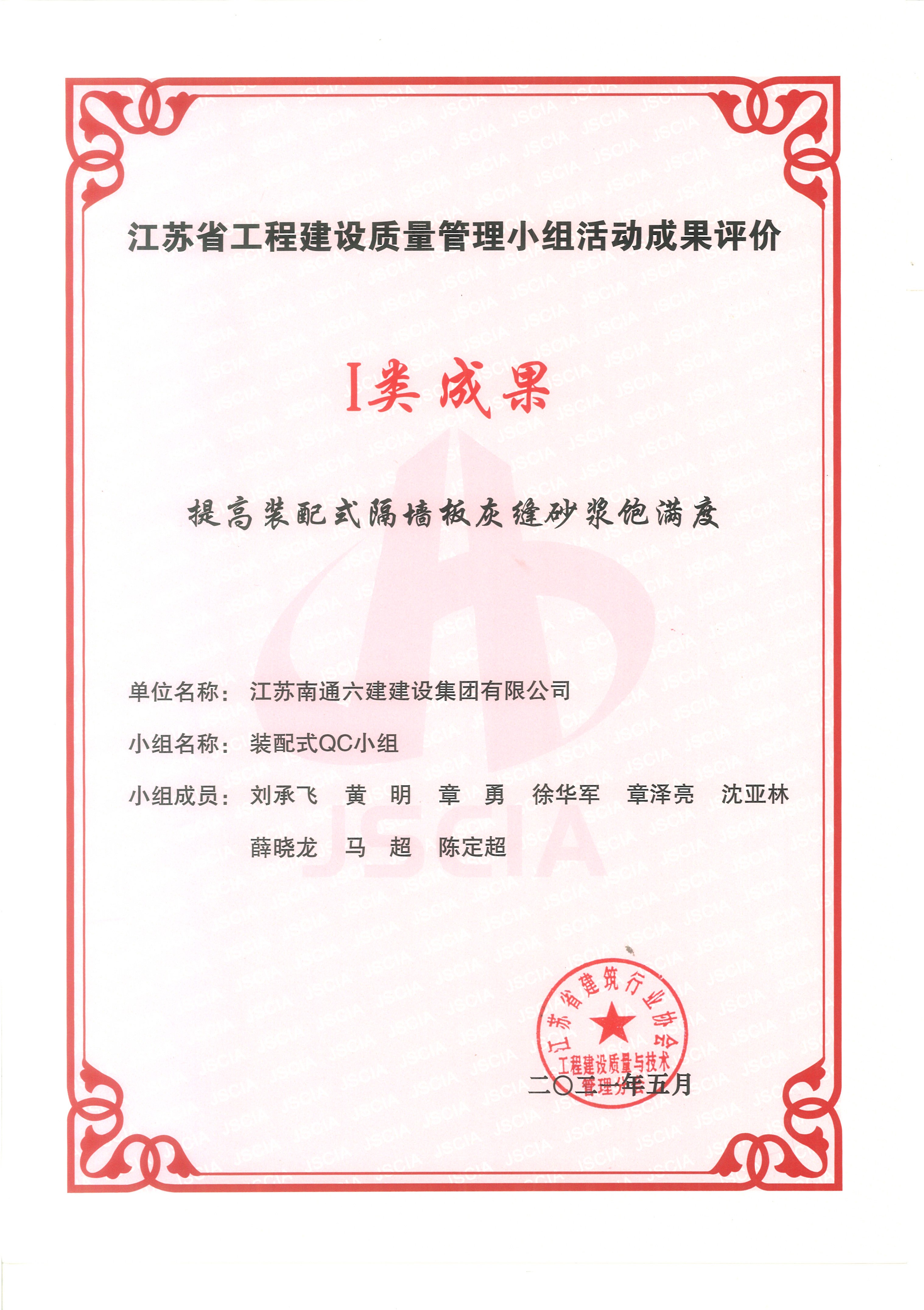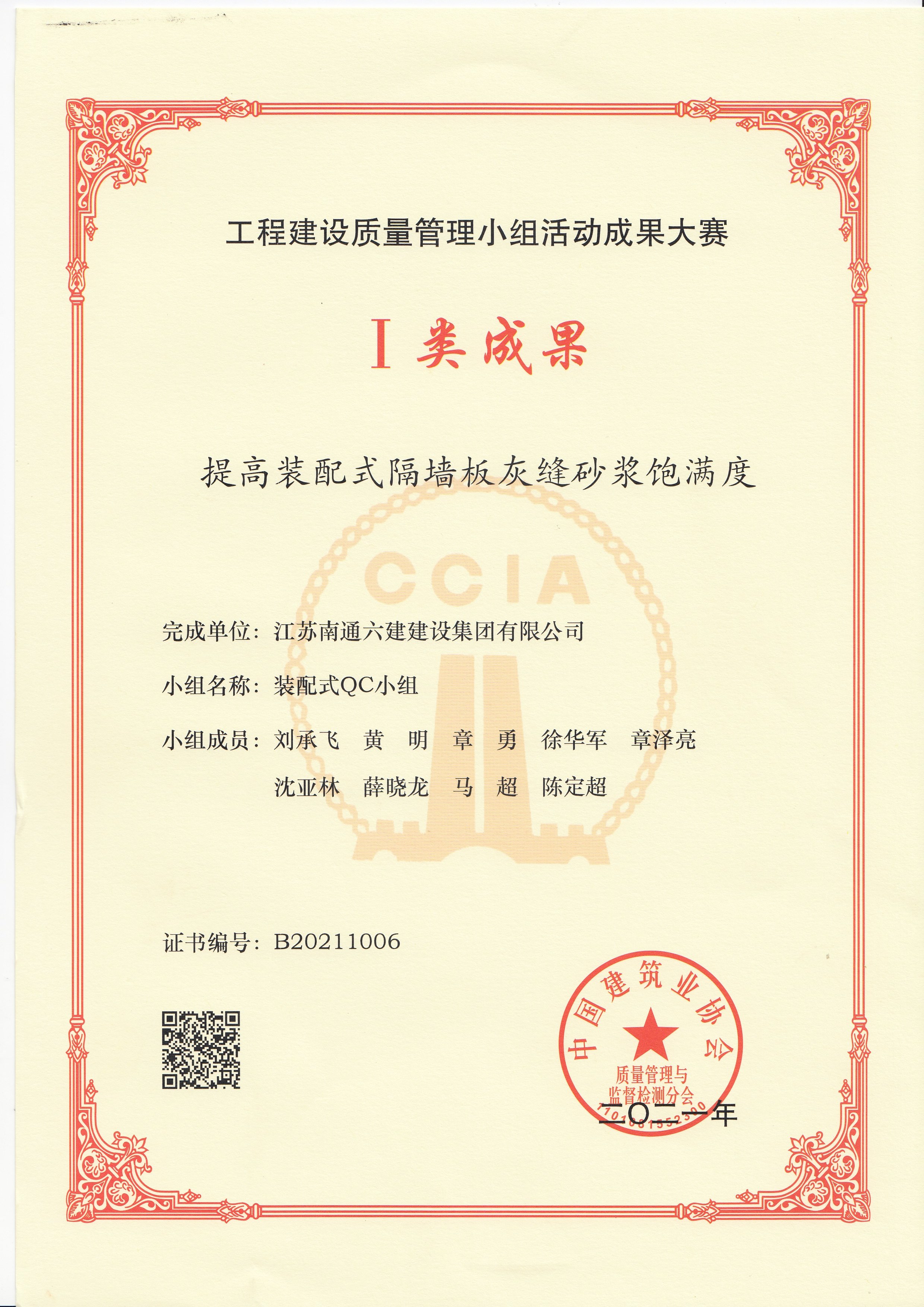 24 | 南通CR18020地塊房地產(chǎn)開(kāi)發(fā)項目-提高裝配式隔墻板灰縫砂漿飽滿(mǎn)度 | 國家級QCⅠ類(lèi)成果 | 2021.10 | 蘇中公司 |