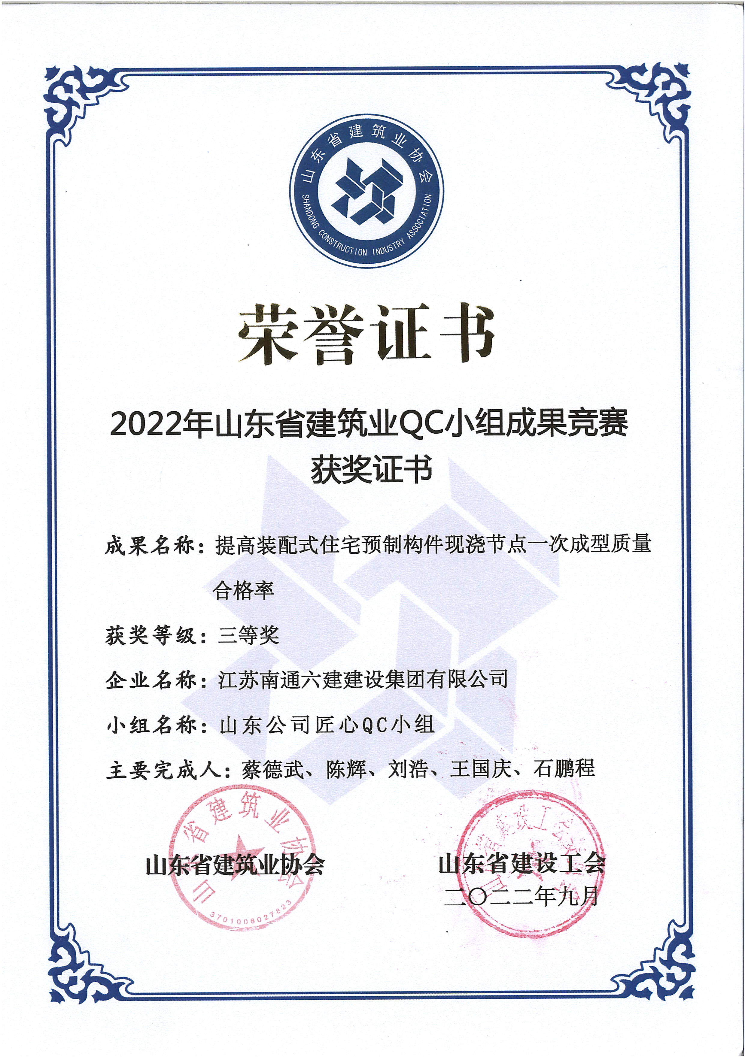6 | 提高裝配式住宅預制構件現澆節點(diǎn)一次成型質(zhì)量合格率 | 山東省三類(lèi)獎 | 2022.9 | 山東總公司 |